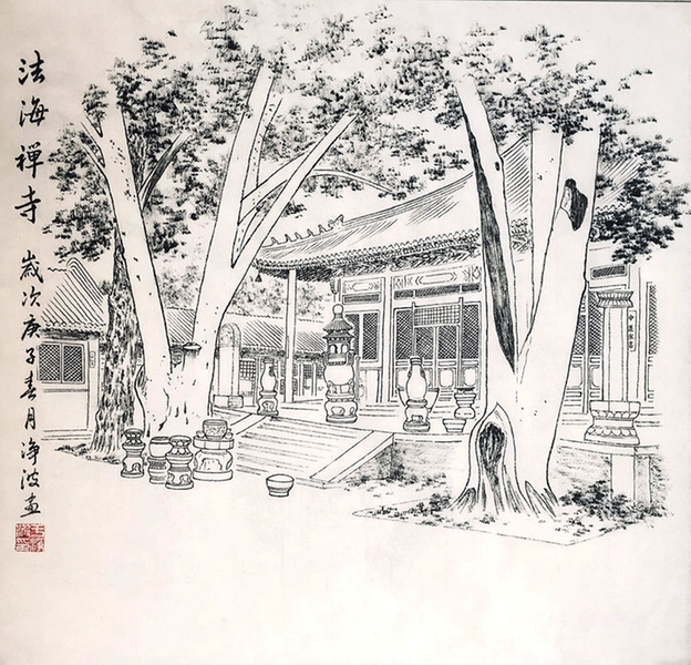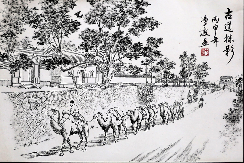 横贯模式口有一条东西向的龙形古道,西起模式口隘口,中间是北京市第九中学,东边到模式口水电站,全长1500米,也就是如今的模式口大街,它东接京城、西通塞外,这是几百年来贯穿京城与塞外的京西古道模式口段。京西古道俗称“驼铃古道”,而模式口正是当时北京饲养骆驼最多的地方。昔日的模式口大街基本就是何大齐笔下的“京西古道模式口风情图”的样子,那时磨石口有四座过街楼,这也是北京唯一一个一村有四座过街楼的村庄。沿街上有“刘家铁匠铺”“ 李记煤栈”“栗家药铺”“西洪信百货店”“宋记大车铺”“恒德成布庄”“绸缎布社”“东洪信百货店”“ 棚铺”“东茂盛”“修德堂”“邓家油铺”“梁记茶”“ 大德成”“杏花村”“天兴居”“酱菜园”等几十个店铺,五行八作,无所不有;流动的摊贩更是不胜枚举,如卖糖葫芦的、卖面茶的;东口北侧还有神秘的“承恩寺”,村中正北翠微山南麓有可与敦煌、永乐宫壁画相媲美的法海寺。站在古道中段向北望去,法海寺像个得道的老者,千百年来静静俯视着这条龙形古道上的芸芸众生。