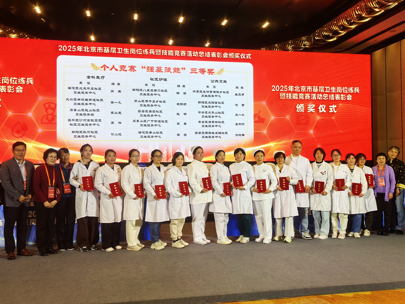 区卫健委自2025年4月启动基层岗位练兵活动以来,按照“立足岗位、注重实用”原则,以“砺剑基层 强基赋能”为主题,精心组织,周密部署,实现了从“练兵”到“备赛”一体化推进。本次比赛中,参赛选手沉着应对、稳定发挥,最终集体个人项目获得双丰收,凭借完善的组织保障,我区获得了“优秀组织奖”殊荣。在个人项目中,我区社区卫生人才积极参与,在多个赛道展现了专业实力:八宝山社区卫生服务中心殷园园获得个人康复专业二等奖、赵山社区卫生服务站李业亮获得个人全科专业三等奖、广宁社区卫生服务中心高熹获得个人护理专业三等奖、广宁社区卫生服务中心尹晓琴获得个人药学专业三等奖。在市级决赛现场,我区参赛团队的选手凭借扎实功底同样斩获了佳绩,来自五里坨社区卫生服务中心的全科、中医、护理、康复、药学、公卫等多专业联合团队,以紧密协作的实战表现荣获了团队决赛全市第七名。