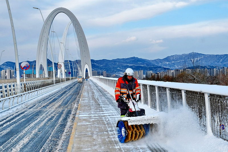 ▲环卫工人正在清理路面积雪。 摄影/王守斌