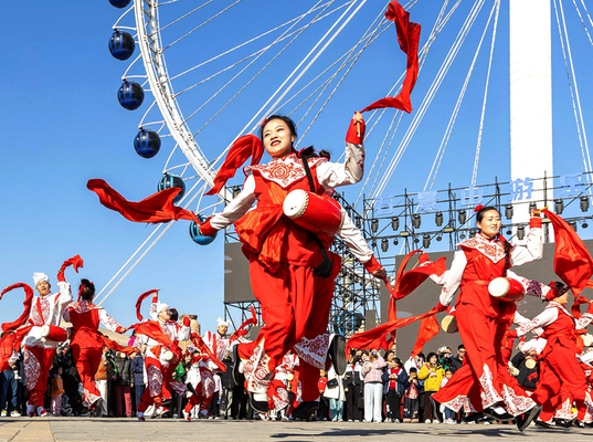 活动内容丰富多彩,集非遗表演、光影艺术、特色美食、趣味互动于一体。文艺演出板块精心策划四大主题,全天共计21场精彩节目轮番上演:气势恢宏的非遗安塞腰鼓、年味浓郁的舞龙舞狮、绚丽夺目的“火龙钢花”演绎“龙在火中飞”的奇观;“时空穿越”主题花车与鱼灯巡游巧妙融合国潮风尚与非遗韵味,摩天轮舞台持续献上中西荟萃的歌舞表演,更有全民参与的“新春蹦迪”环节点燃欢乐气氛。